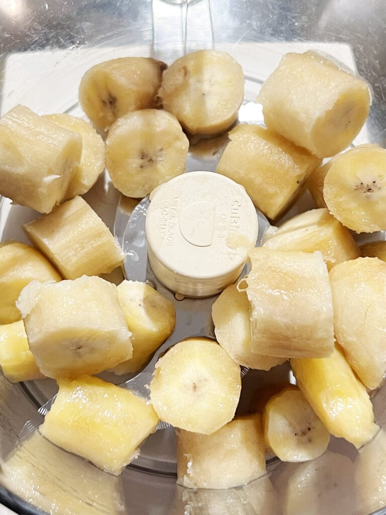 - Pela los plátanos, córtalos en trozos y congélalos al menos 3–4 horas (o toda la noche).
