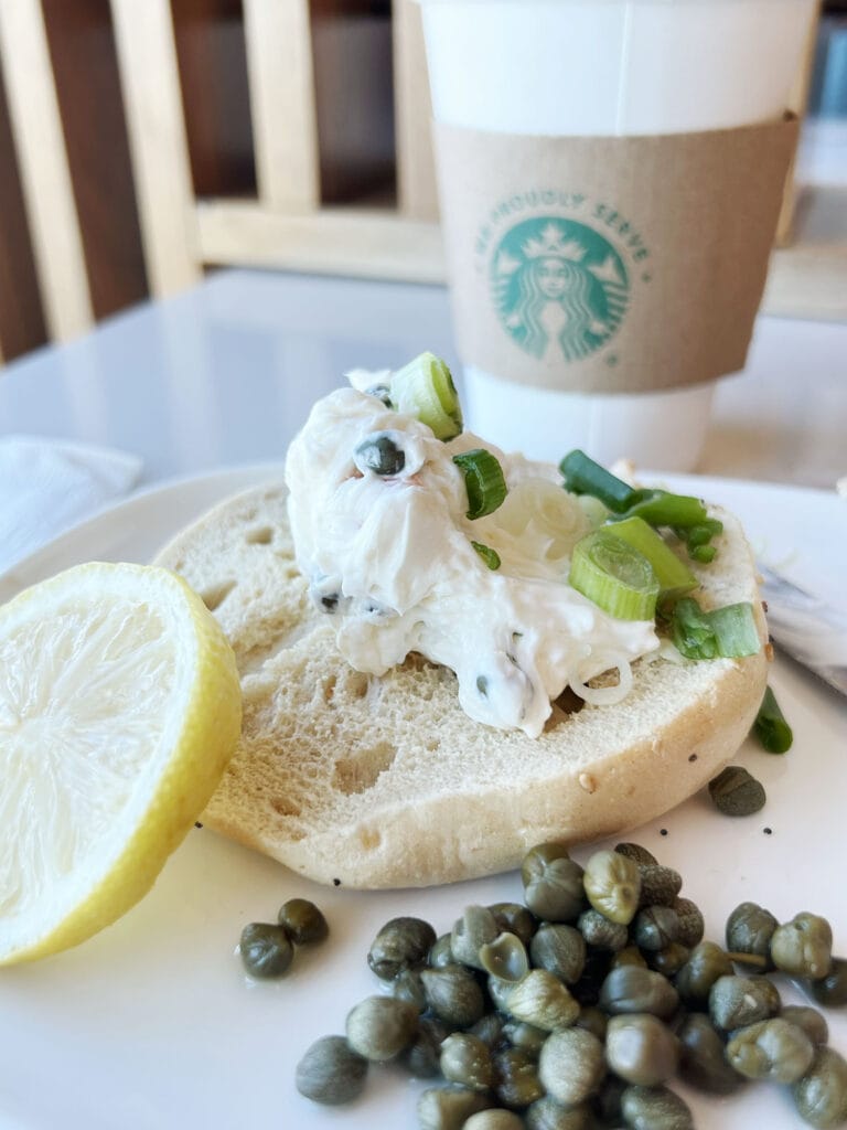 Le stand de bagels a été mon préféré. Tu fais griller ton bagel toi-même, et les options de cream cheese sont censées être faites maison, d’après les pancartes. J’ai pris un Everything bagel, avec du cream cheese au saumon fumé sur une moitié et du cream cheese à la ciboulette sur l’autre.