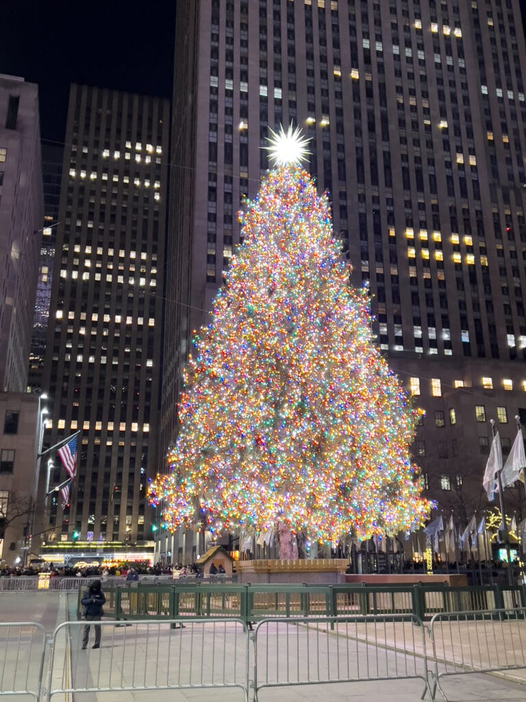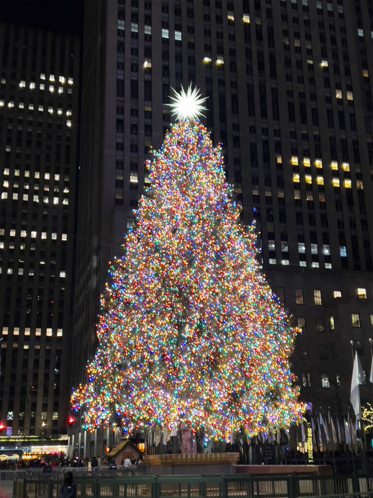 Le sapin de Noël du Rockefeller Center est généralement un épicéa de Norvège (Norway spruce) mesurant entre 20 et 30 mètres de hauteur. Il provient de terrains privés, souvent situés dans le nord-est des États-Unis. Le sapin est décoré avec environ 50 000 lumières LED et, depuis 2018, surmonté d’une étoile en cristal Swarovski. C’est un spectacle magique et un incontournable si vous êtes à New York en décembre.