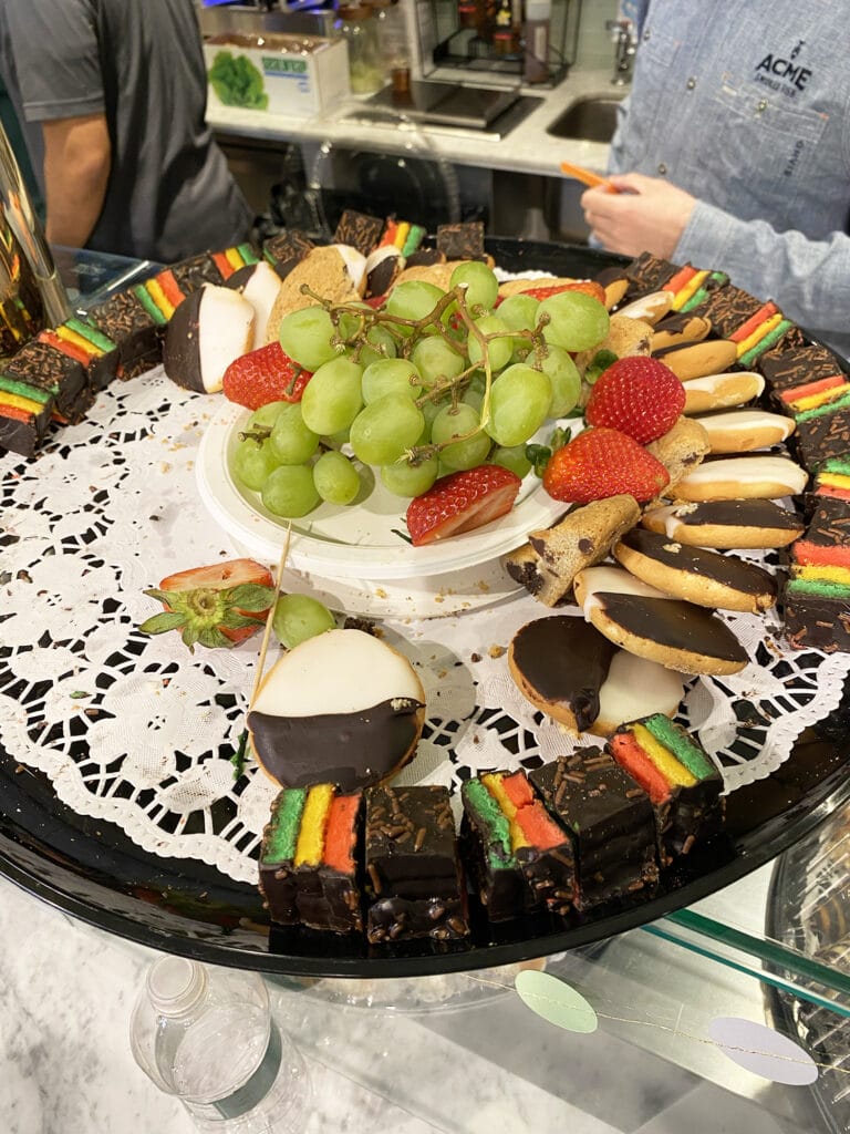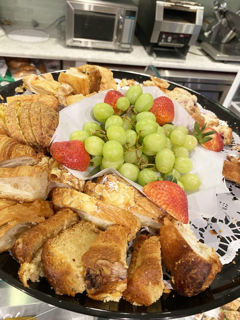 Das Buffet hatte alles: bunte Obstplatten, Desserttabletts und Mini-Proben von den verschiedenen Bagelsorten. Der Bagel mit Blaubeer-Frischkäse auf Plain Bagel war nicht so seins (zu süß, zu wenig Kontrast), aber der Klassiker – Everything Bagel mit Lachs, Frischkäse, Kapern, Tomate und Salat – war richtig gut. Knackig, milder Lachs, sehr sauberer Geschmack. Er hat auch den Plain Bagel mit Lachs und normalem Frischkäse probiert – beide Daumen hoch. Da sind wir uns einig: Damit macht man nie was falsch.