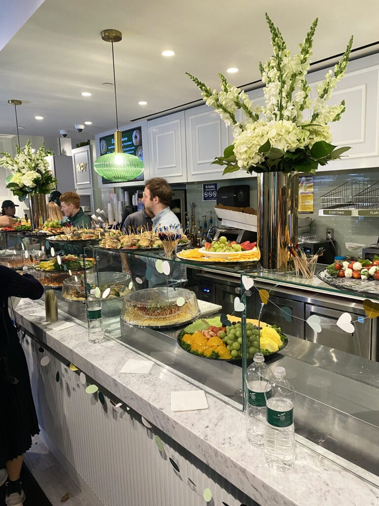 Falls du dich jemals gefragt hast, wie eine Bagel-Party in New York aussieht, stell dir einfach einen Raum voller Leute vor, die Räucherlachs und Frischkäse essen, während im Hintergrund „Macarena“ läuft. Dazu ein Tablett mit Obst, Rainbow Cookies, Sekt in Plastikbechern und „Eye of the Tiger“ – und voilà: Willkommen zur Eröffnung des neuen Ess-a-Bagel Shops in FiDi.