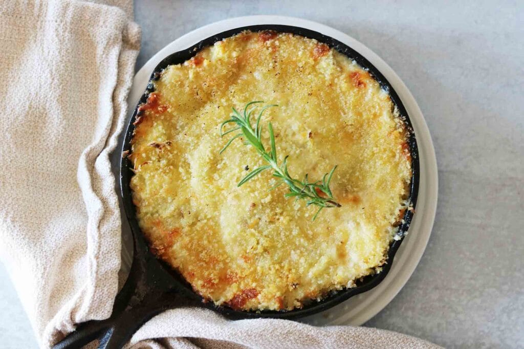 - Bestreue mit Semmelbröseln und backe etwa 20-25 Minuten im Ofen, oder bis der Dip an den Rändern blubbert und die Oberseite goldbraun ist.