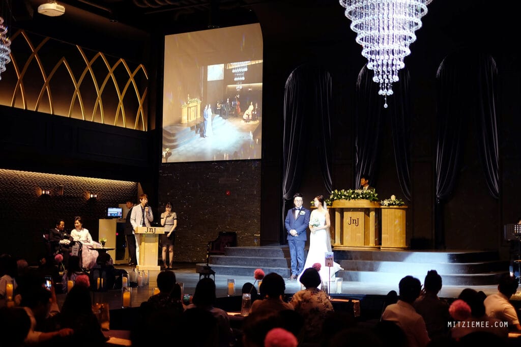 Zunächst gab es einen Auftritt eines Hochzeitssängers, und dann betrat die Braut die Bühne, indem sie von einer balkonähnlichen Struktur hinabstieg. Was für ein Auftritt! Dann führte ihr Vater sie langsam den Laufsteg hinunter bis zum Ende, wo der Bräutigam und seine Eltern sowie die Schwiegermutter bereits warteten. Es fühlte sich an wie eine Filmszene, mit der Braut als wunderschönem Star.